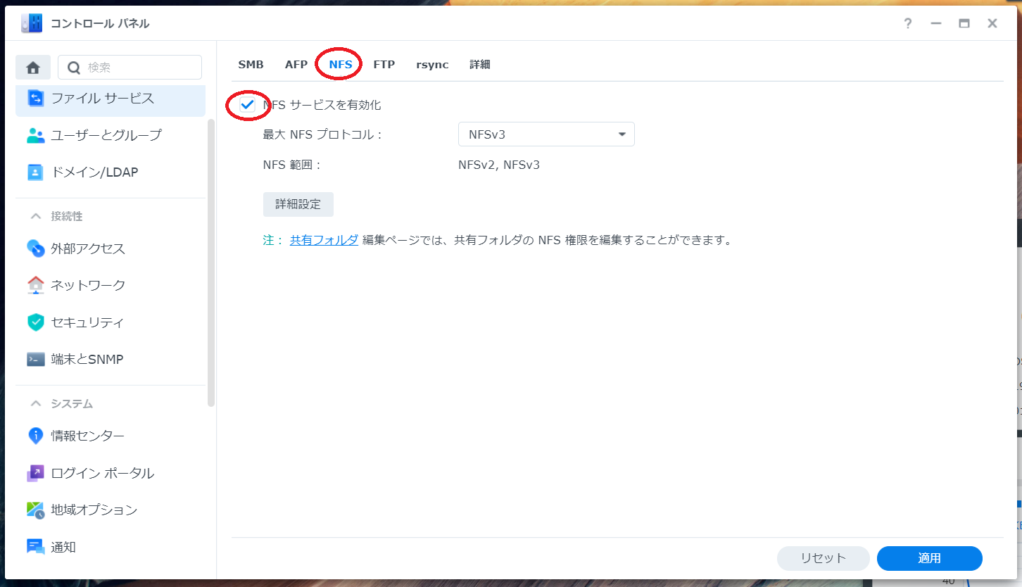 DS118 の設定は DiskStation Manager(DMS)7.0 の「コントロールパネル」にある「ファイルサービス」からポチポチと。NFSv4 も選択できるけど自鯖環境ではメリットもなさそうだから Proxmox の既定でもある NFSv3 を選択。