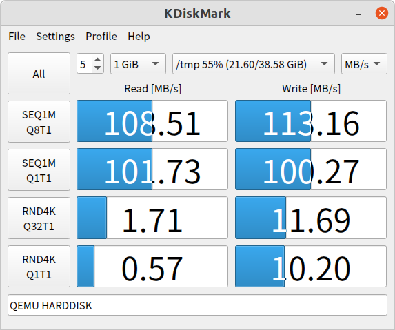 仮想マシン(Ubuntu)でストレージを NFS に移動して測定してみた。当たり前だけど GbE の制限があるところ、ほぼ DS118 の仕様どおりの速度が出ている。