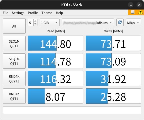 仮想マシンの Ubuntu で実行した KDiskMark の結果はこんな感じ。